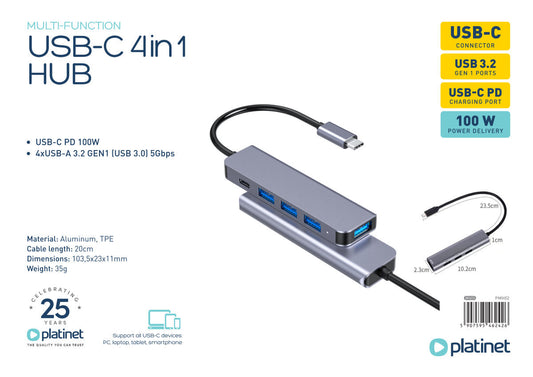 PLATINET HUB USB-C A 4xUSB-A 3.2 5Gbps 10W