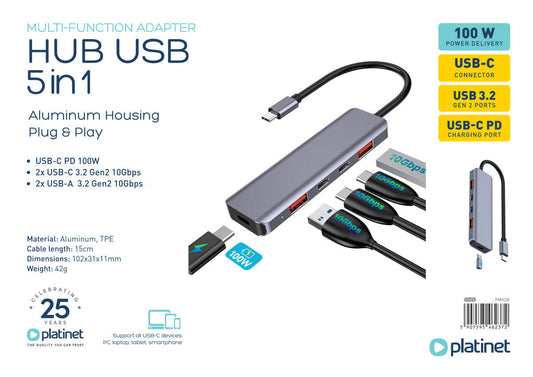 PLATINET HUB USB-C A 4xUSB-A 3.2 + 1xUSB-C PD 100W 5en1 ALUMINIO