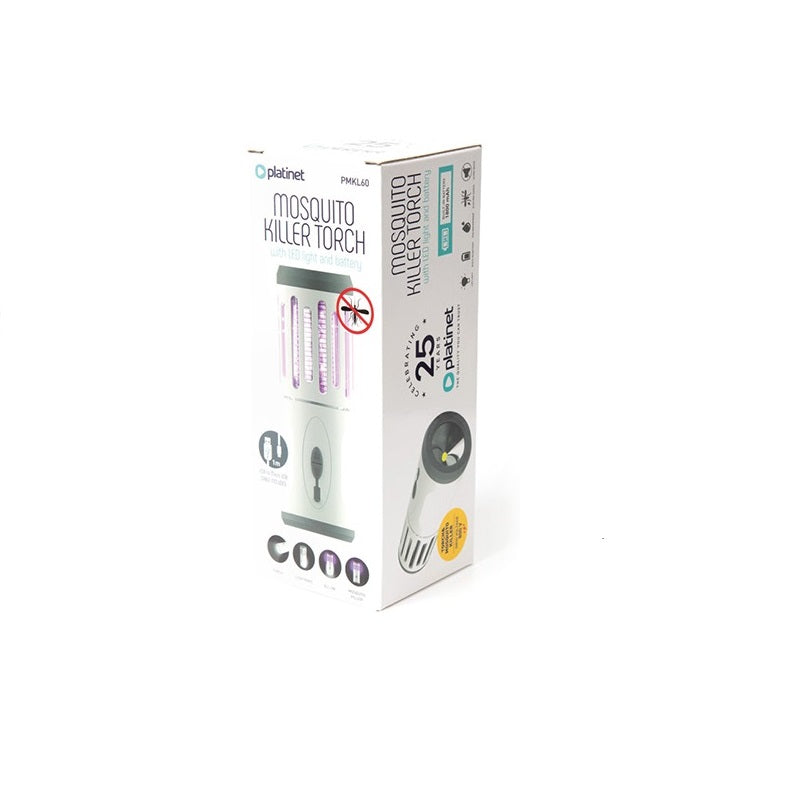 La antorcha antimosquitos Platinet combina una luz LED de 60 lúmenes con una función repelente de mosquitos, ideal para uso en exteriores. Alimentada por una batería recargable de 1800 mAh, ofrece hasta 3,5 horas de autonomía tras una carga completa mediante USB.