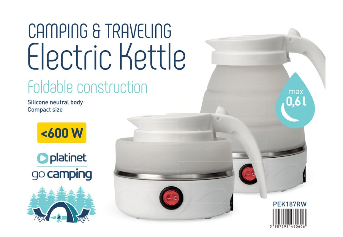 La hervidora eléctrica Platinet es plegable y está fabricada en silicona, acero inoxidable y plástico PP, lo que la hace resistente y fácil de almacenar. Con una capacidad de 0,6 litros y una potencia de 600W, es ideal para calentar agua rápidamente en espacios reducidos.