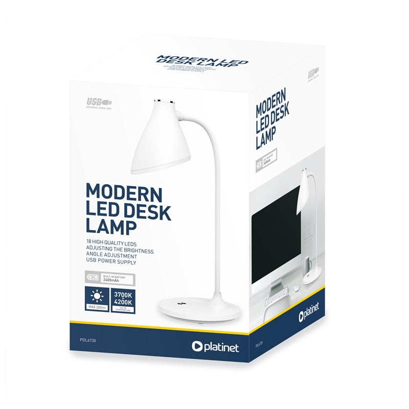 La lámpara de mesa Platinet combina un diseño vintage en color blanco con materiales resistentes como el metal. Es recargable, cuenta con una batería de 2400mAh y ofrece hasta 3 horas de uso continuo, ideal para iluminar espacios pequeños o crear un ambiente acogedor.