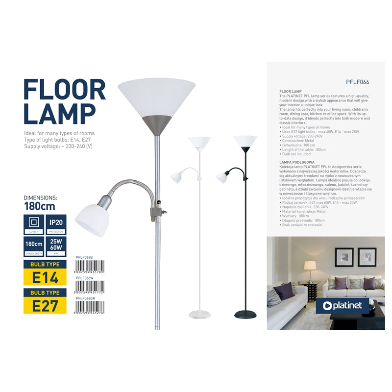 La lámpara de pie Platinet, en color blanco y fabricada en metal, con soportes para bombillas E14 y E27 y potencias máximas de 25W y 60W respectivamente.