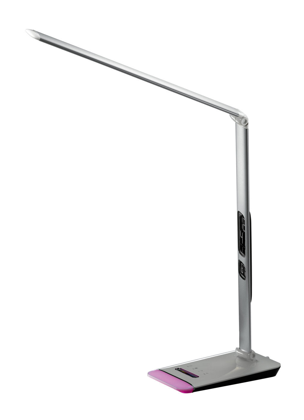 Lámpara de escritorio LED, con un diseño moderno y de alta calidad. Diseño acabado en aluminio. Dispone de luz en la base regulable para varios colores, despertador, temperatura, fecha y hora, permite regular el nivel de intensidad de iluminación.