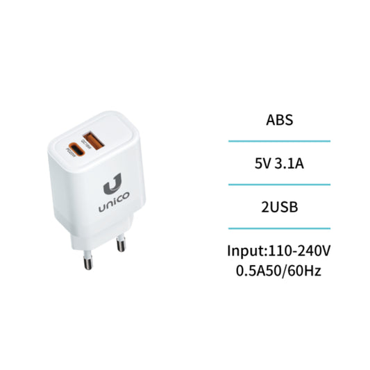 UNICO HC1687 CARGADOR DUAL 1 USB A + 1 TIPO-C PD3.0 20W BLANCO