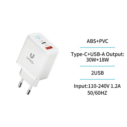 UNICO HC4174 CARGADOR DUAL 1 USB A + 1 TIPO-C PD30W QC 30W CON CABLE TIPO-C A TIPO-C CARGA RÁPIDA