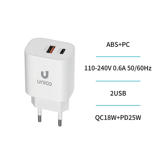 UNICO HC1700 CARGADOR DUAL 1 USB A + 1 TIPO-C PD25W QC18W CARGA RÁPIDA BLANCO