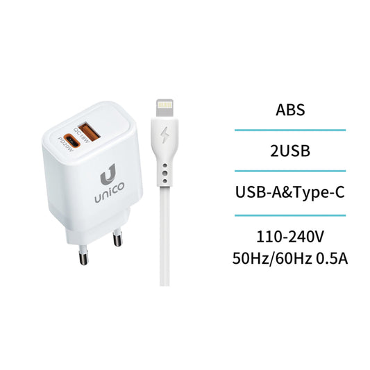 UNICO HC2346 CARGADOR DUAL 1 USB A + 1 TIPO-C PD20W CON CABLE TIPO-C A LIGHTNING BLANCO