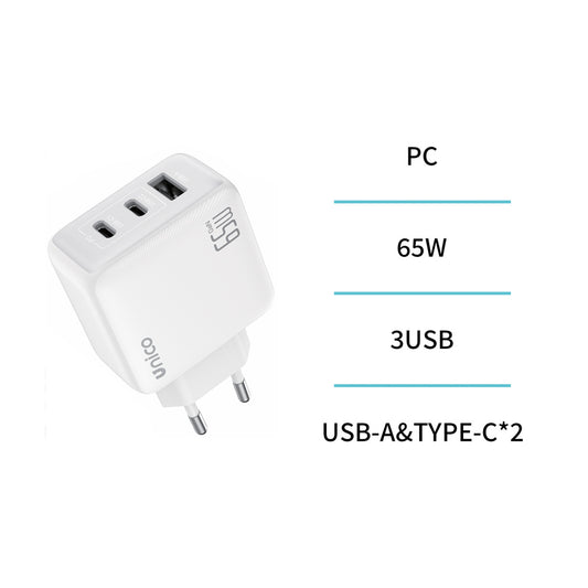 UNICO HC6141 CARGADOR TRIPLE PD65W 1 USB A + 2 TIPO-C GAN GS TUV CARGA RAPIDA BLANCO